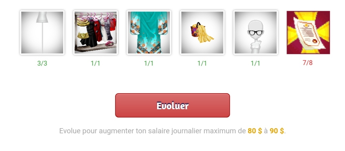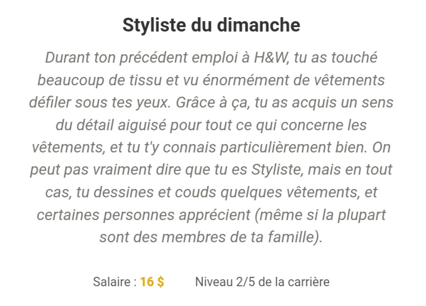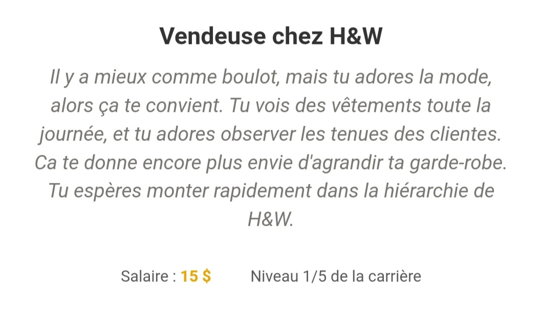 | Il y a mieux comme boulot, mais tu adores la mode, alors ça te convient. Tu vois des vêtements toute la journée, et tu adores observer les tenues des clientes. Ca te donne encore plus envie d'agrandir ta garde-robe. Tu espères monter rapidement dans la hiérarchie de H&W. | |||||||