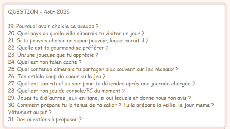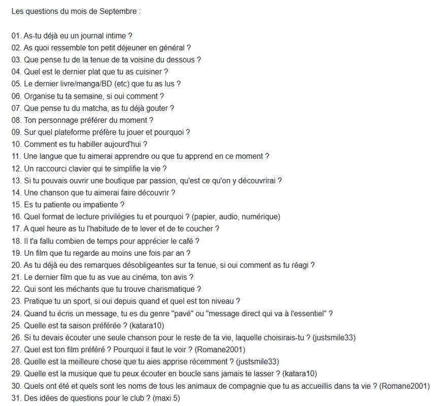 A une certaines date du mois, je vous inviterai à participer au créations des prochaines questions.