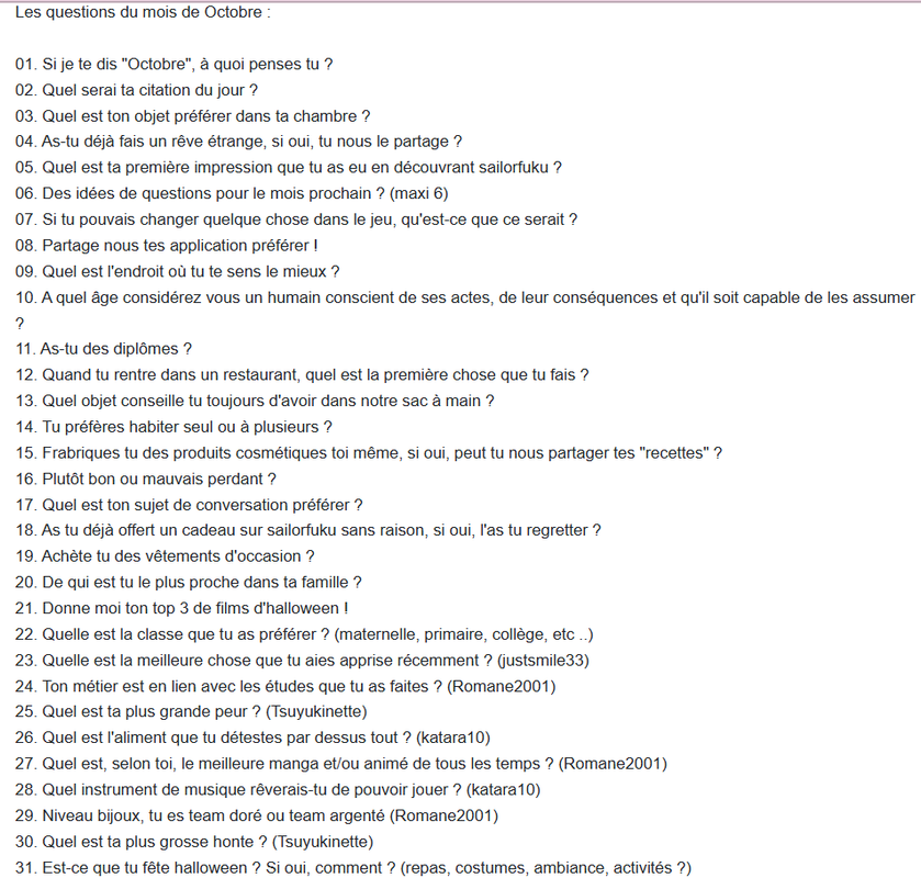 01. Si je te dis "Décembre" à quoi pense tu ? 02. Penses-tu acheter un calendrier de l'avent ? Si oui, lequel ? 03. Un nuisible que tu es incapable d'éliminer ? Un, au contraire, pour lequel tu n'éprouve aucune pitié ? 04. Fait-il froid chez toi ? A-t-il déjà neigé ? 05. Si tu pouvais changer une chose à cette journée, quelle serait elle ? 06. Quels sont tes plans pour ce soir ? 07. As tu fais une nouvelle rencontre récemment, qui donc ? 08. Quel est ta dernière expérience de paix intérieur ? 09. Qu'à tu manger de remarquable au cours de cette dernière semaine ? 10. Aimes tu faire les marché de Noël ? Si oui, achète tu des choses, de la nourriture ou bien tu es plutôt exposante ? 11. Conseille nous un livre pour décembre. 12. Quel site tu consulte tout les jours et pourquoi ? 13. Vas tu faire des échanges de cadeaux de Noël avec d'autres joueuses de SF ? 14. Comment te rend tu utile ? 15. Quel tenue vas-tu porter à Noël et jour de l'an ? 16. Selon toi, gagne tu assez d'argent ? 17. Qu'est-ce que tu faisais juste avant de te connecter sur SF ? 18. Quel est la dernière chose que tu as avaler aujourd'hui ? 19. As-ton avis, quel âges à le Père Noël ? 20. Qu'as tu demandé pour Noël ? 21. Que penses tu de faire croire aux enfants l'éxistance du Père Noël ? T'es parents t'ont ils aussi fait croire au Père Noël ? Que ferais-tu si tu avais des enfants ? 22. Quels sont tes plans pour le réveillon de Noël ? 23. Tu es plutôt lavage de cheveux tout les jours ou bien une à deux fois dans la semaine ? Quel est ta routine pour tes cheveux ? 24. BON REVEILLON ! Décrit nous le planning de ta journée ! 25. Joyeux Noël ! Comment s'est passé ton réveillon de Noël ? Es-tu satisfaite ? 26. Qu'as tu eu comme cadeaux à Noël ? 27. Si un cadeau de Noël te plait pas, est tu du genre à ramener tes cadeaux au magasin pour les échanger, ou bien à les offrir a quelqu'un d'autre ? 28. Qui est la dernière personne qui ta mis en colère et pourquoi ? 29. Si tu devais passer cinq année en prison, qu'auriez vous enfin le temps de faire ? 30. Raconte nous ton mois de décembre ! 31. Comment vas tu fêter la nouvelle année ?